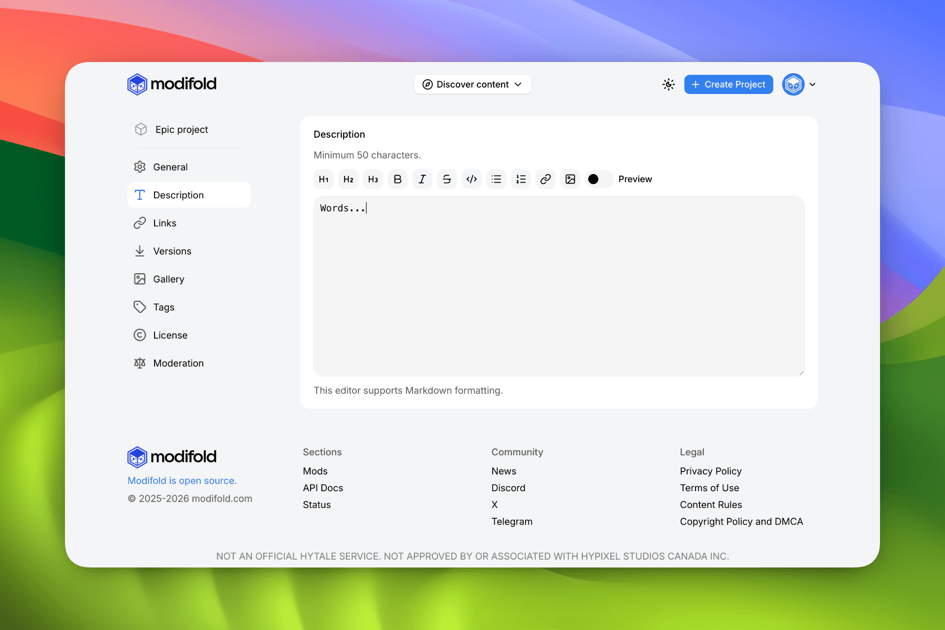 Modifold supports a convenient Markdown editor where you can describe in detail: